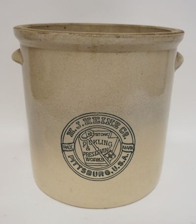 H.J. HEINZ STONEWARE PICKLE CROCK. PITTSBURGH PA. 11 3/4 INCHES HIGH. 12 INCH DI