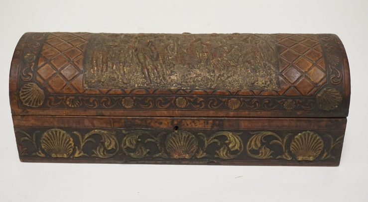 ITALIAN LEATHER DOME TOP BOX WITH A PRESSED AND TOOLED DECORATION INCLUDING NYMP