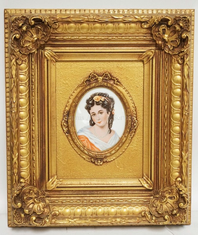 LIMOGES TRANSFER DECORATED PORCELAIN PORTRAIT IN AN ORNATE GOLD GILT FRAME. 11 3
