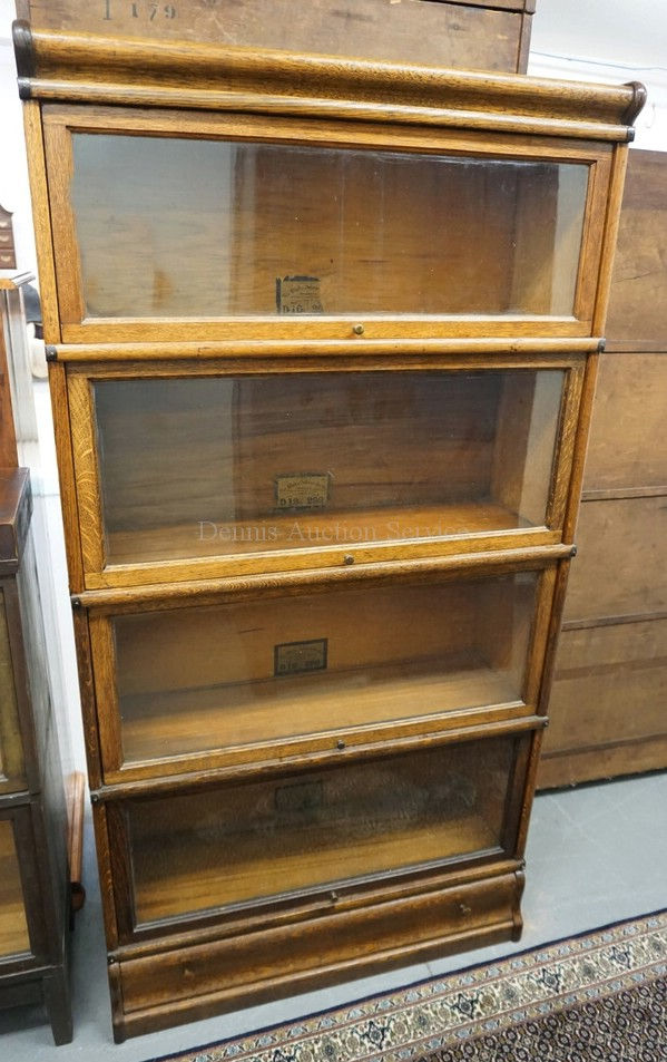 1073_WEIS 4 STACK OAK BARRISTER BOOKCASE WITH TOP AND BASE. 34 INCHES WIDE. 63 1