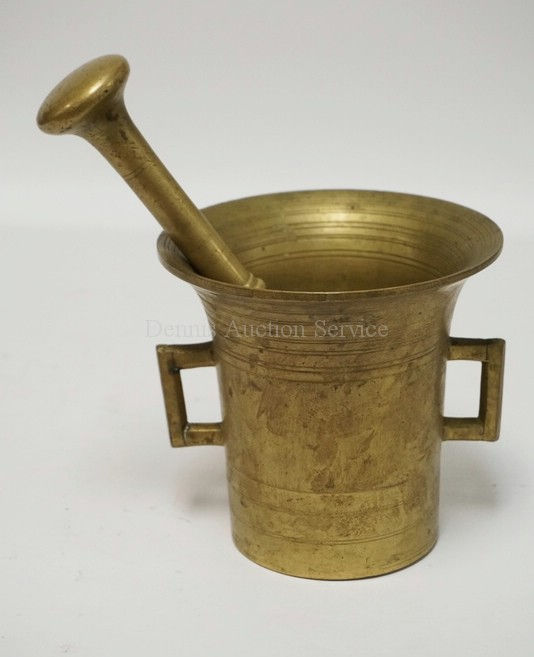 BRASS MORTAR & PESTLE. MORTAR MEASURES 6 1/8 INCHES HIGH.