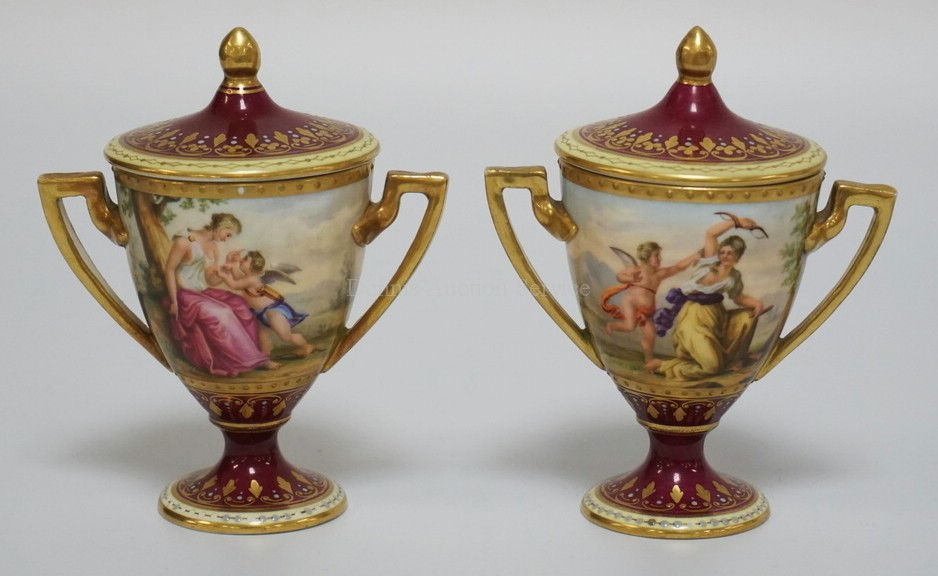 1007_PAIR OF ROYAL VIENNA DIMINUTIVE LIDDED URNS. ARTISTS SIGNED *C. WEH*. VIENN
