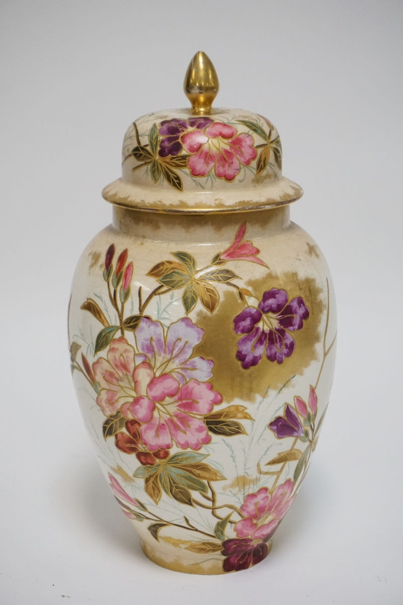 ROYAL BONN HAND PAINTED URN W/LID. HAS CRAZING & STAINING. 15 INCHES HIGH.