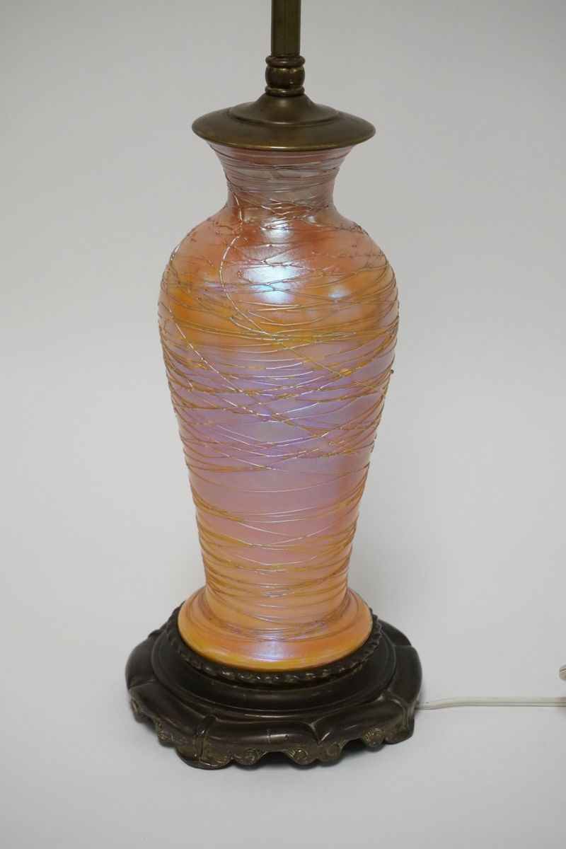 DURAND ART GLASS LAMP WITH APPLIED THREADING. 26 3/4 INCHES OVERALL. 9 1/2 INCH