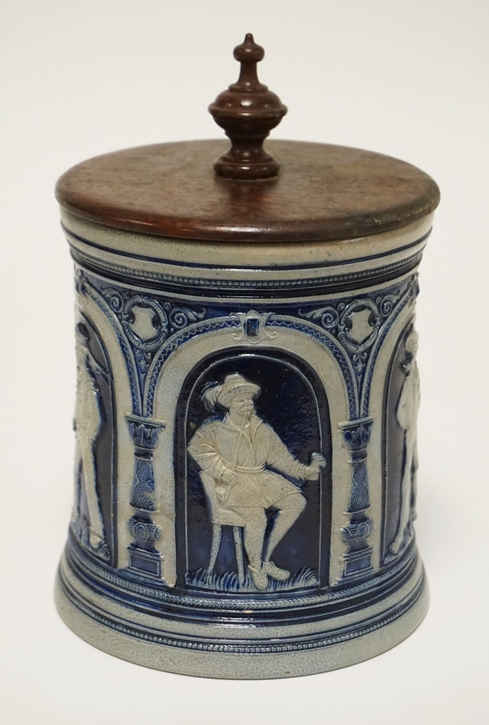 1071_GERMAN SALT GLAZED BLUE DECORATED POTTERY TOBACCO JAR WITH A WOODEN LID. SE