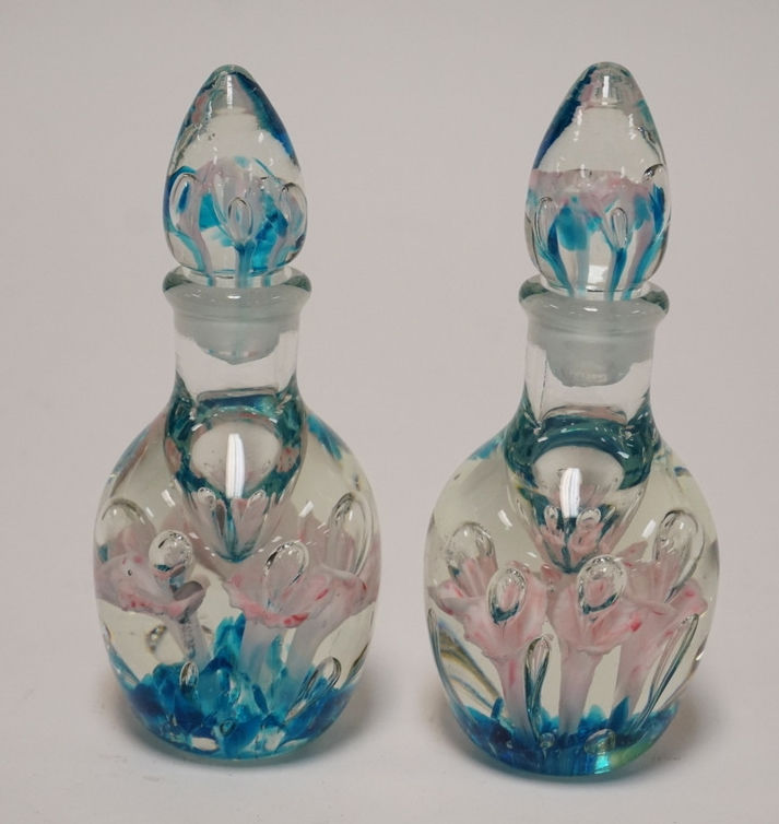 1072_PAIR OF ART GLASS PERFUME BOTTLES WITH STOPPERS. INTERNAL FLORAL DECORATION